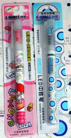 OH! hoy, por primera vez he conseguido entrar en esas paginas chinas que vienen en estos productos de 3 pesos (que ya comente antes). Hoy compre dos plumas de gel, disque con lámpara integrada a 5 pesos cada uno (como la de la foto). La página que viene escrita atrás es www.chuangsi.cn Son puros productos "escolares", borradores, lapiceros, lápices de puntillas, y puntillas. Todo kawaii.