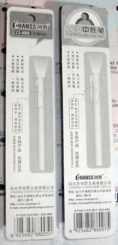 OH! hoy, por primera vez he conseguido entrar en esas paginas chinas que vienen en estos productos de 3 pesos (que ya comente antes). Hoy compre dos plumas de gel, disque con lámpara integrada a 5 pesos cada uno (como la de la foto). La página que viene escrita atrás es www.chuangsi.cn Son puros productos "escolares", borradores, lapiceros, lápices de puntillas, y puntillas. Todo kawaii.